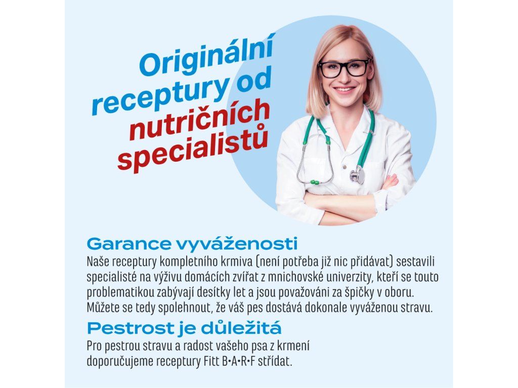 Pro pestrost stravy a radost vašeho psa z krmení doporučujeme receptury Fitt® (hovězí, krůtí, kuřecí) občasně střídat.