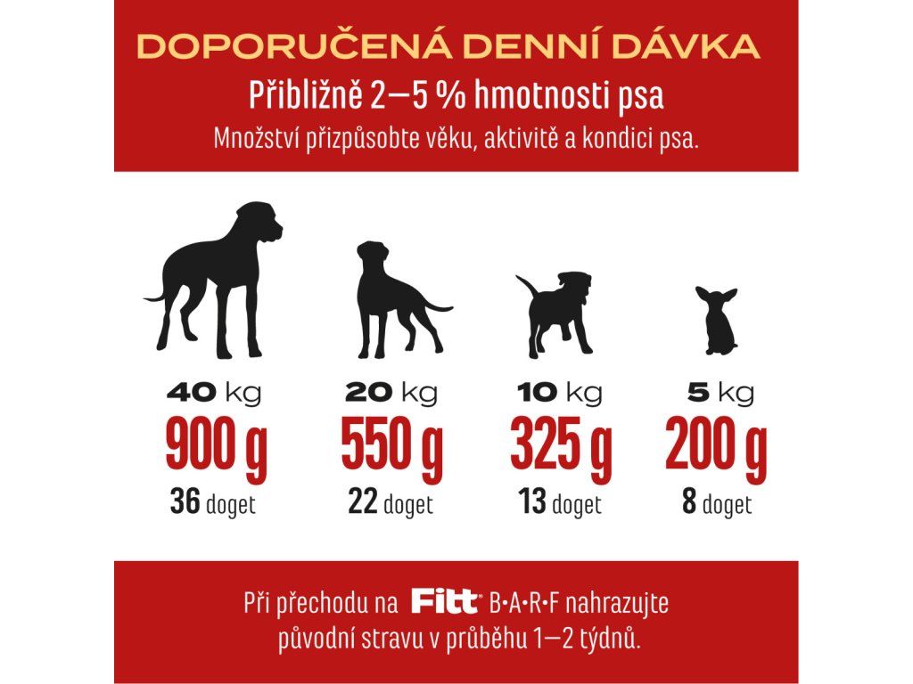 - PRŮMĚRNÁ DENNÍ KRMNÁ DÁVKA 2–4% hmotnosti psa (podle plemene, věku, aktivity a kondice) tj. přibližně: