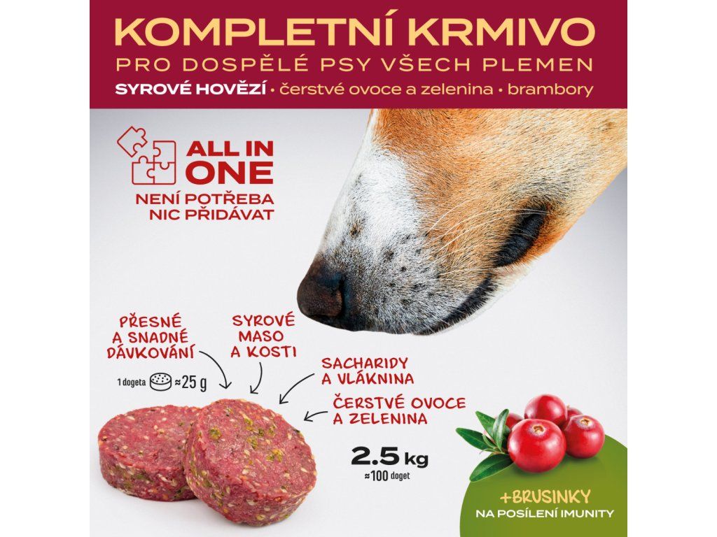 - Přesné dávkování – dogety (á 25 g) vhodné i pro malá plemena; kolik krmíte máte pod kontrolou.