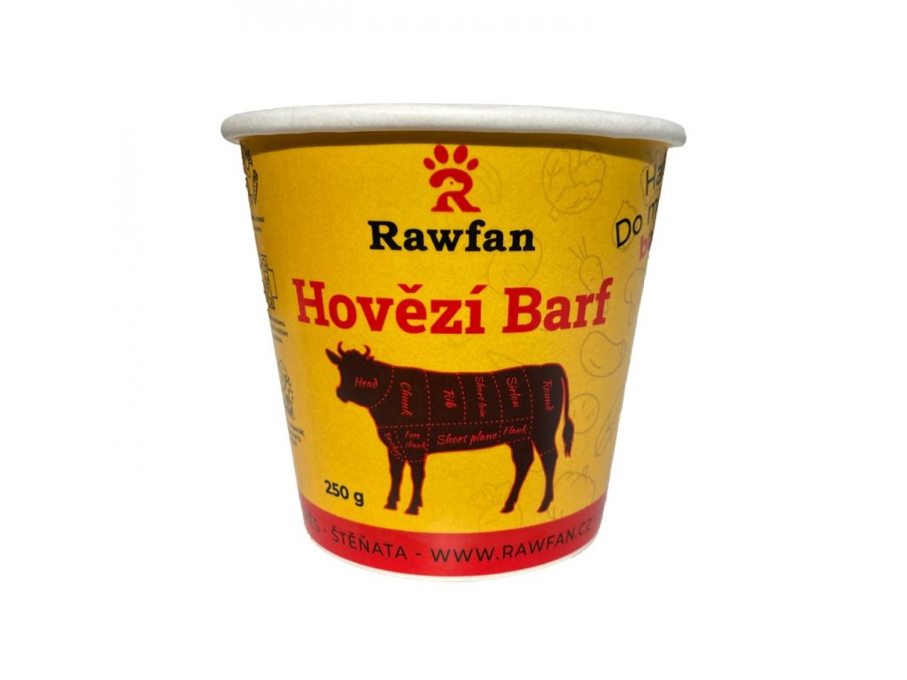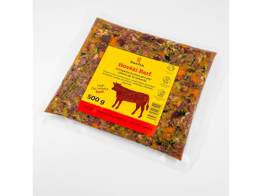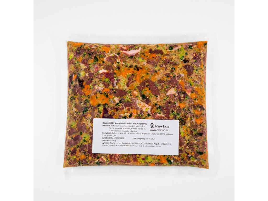 63,5% hovězí svalovina, hovězí srdce a hovězí játra