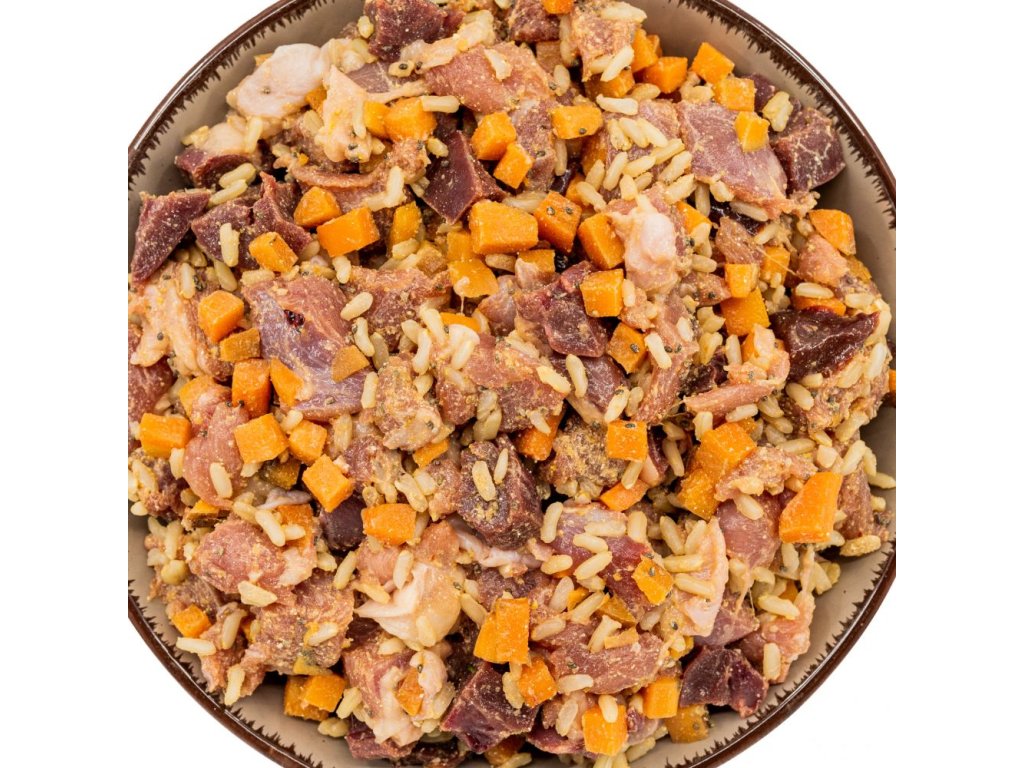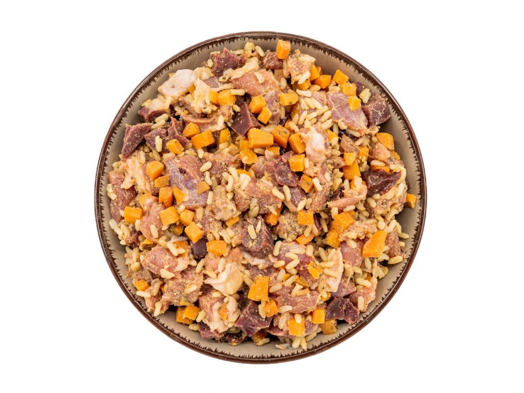 - 35 % hnědá rýže, batáty, mrkev, chia semínka, rybí olej