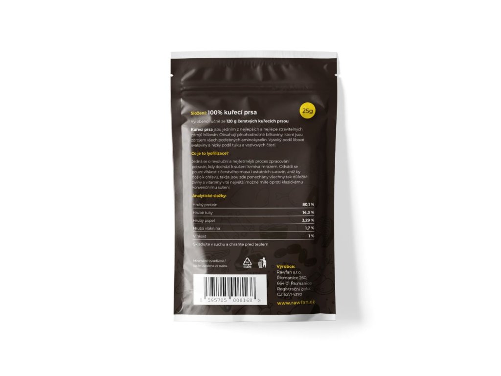 K výrobě 25 g lyofilizovaného kuřecího masa bylo použito 120 g syrového kuřecího masa.