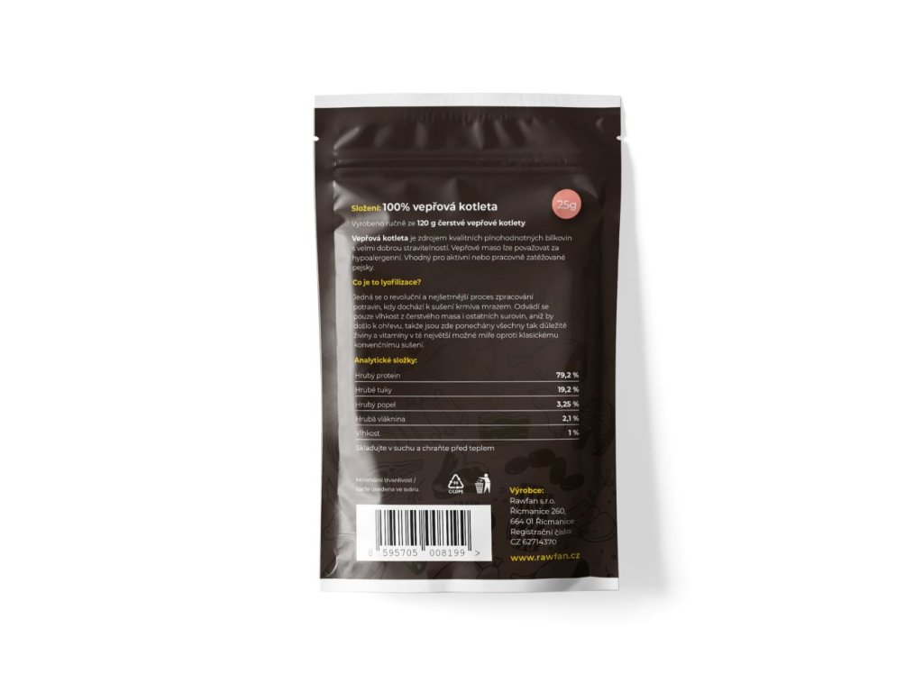 K výrobě 25 g lyofilizovaného vepřového masa bylo použito 120 g syrového vepřového masa.