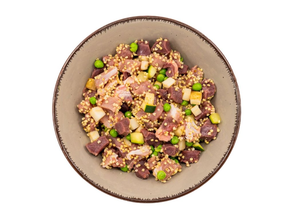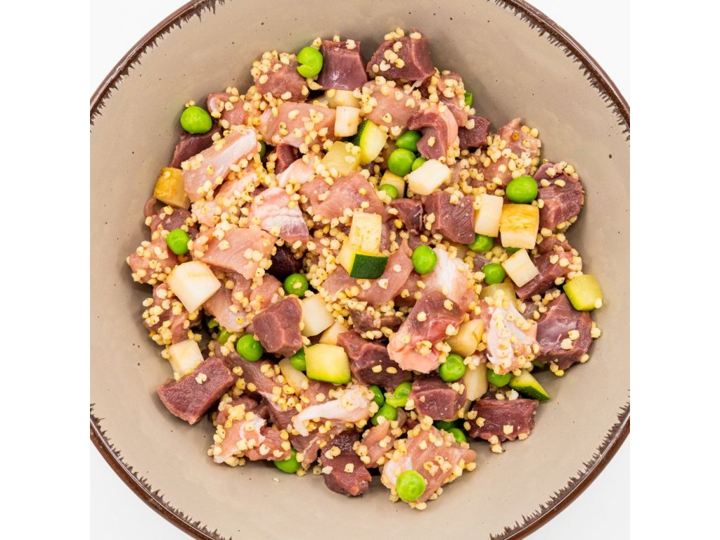 - 34,8% jáhly, zelený hrášek, petržel, cuketa, dýňová semínka, rybí olej